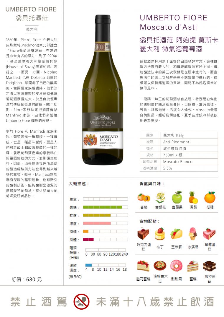 一段獨一無二的葡萄酒感官旅程,特別是它傑出的透明度伴隨深稻草黃色。口感甜、富有個性、芳香、細緻泡沫、活潑令人愉悅。Moscato最適合與甜品、麵粉糕餅搭配,夏季在冰鎮冷卻後飲用最為享受。